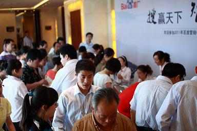在四月底,我們公司召開了“百度營銷中國行動員大會”,給每位員工做好思想動員,希望每位員工在思想上重視這次會議,通過大家的努力保證會議的順利召開,最終完美呈現(xiàn)給廣大客戶。會前一個月我們在鹽城分眾傳媒投放了關(guān)于營銷中國行的宣傳報道片,在一個月的時間內(nèi)滾動循環(huán)播出,同時在鹽城晚報半版的形式進行中國行活動的宣傳,通過鋪天蓋地的宣傳報道給客戶帶來視覺與聽覺的沖擊,把百度中國行的信息席卷鹽城大地,傳達給鹽城地區(qū)所有企業(yè)客戶。在公司五月初把活動日程安排公布以后,市場部開始著手準備活動地點、活動的具體流程、活動各項物料準備等,而商務(wù)部則是在活動前半個多月就開始客戶的邀約。重點在邀約客戶這方面,為了保證會議現(xiàn)場客戶的數(shù)量與質(zhì)量度,我們要求每位商務(wù)人員對于每位客戶首先通過多次電話形式進行溝通,然后以傳真回執(zhí)和送達邀請函的方式確認到場情況。