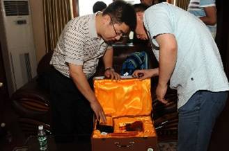 百度領(lǐng)導(dǎo)帶來的寓意深遠(yuǎn)的精美禮品在贈送儀式開始之前,鞏總、金總認(rèn)真查看禮品