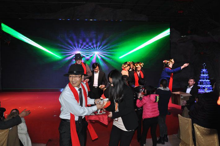 壓軸大戲,老板與總監(jiān)一起上臺(tái)跳大秧歌,伴隨著音樂到臺(tái)下給小伙伴們派發(fā)糖果和糕點(diǎn),掀起了晚宴的高潮。一片歡樂祥和的氣氛結(jié)束了此次的晚會(huì)。